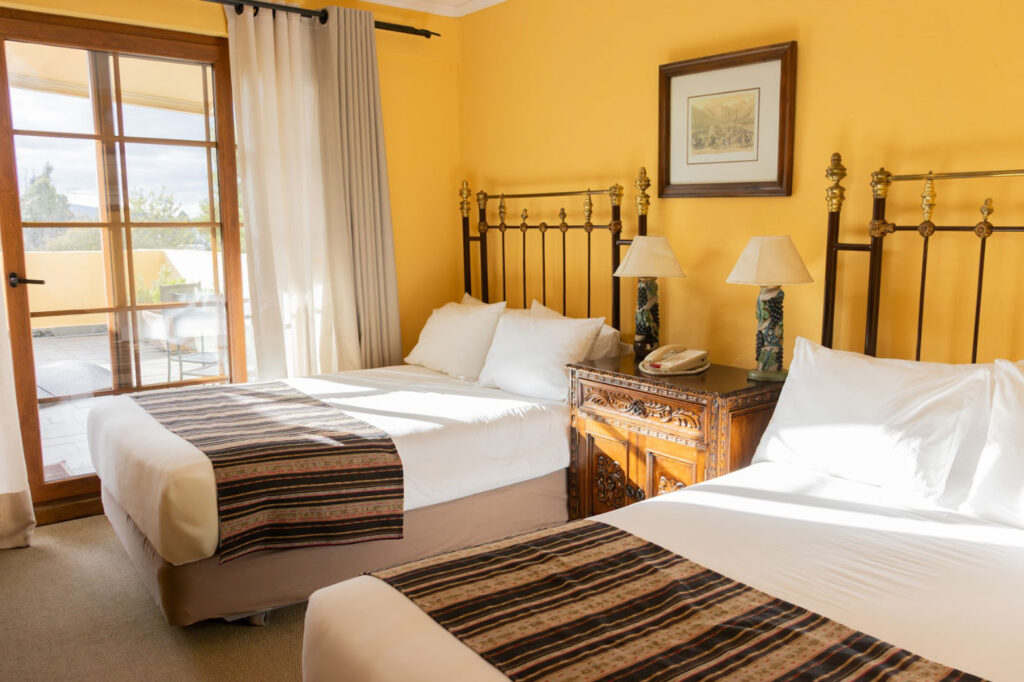 Amplia suite de 25 m² con dos camas Queen, aire acondicionado y terraza privada. Ofrece un ambiente funcional y confortable, ideal para relajarse y disfrutar de hermosas vistas.